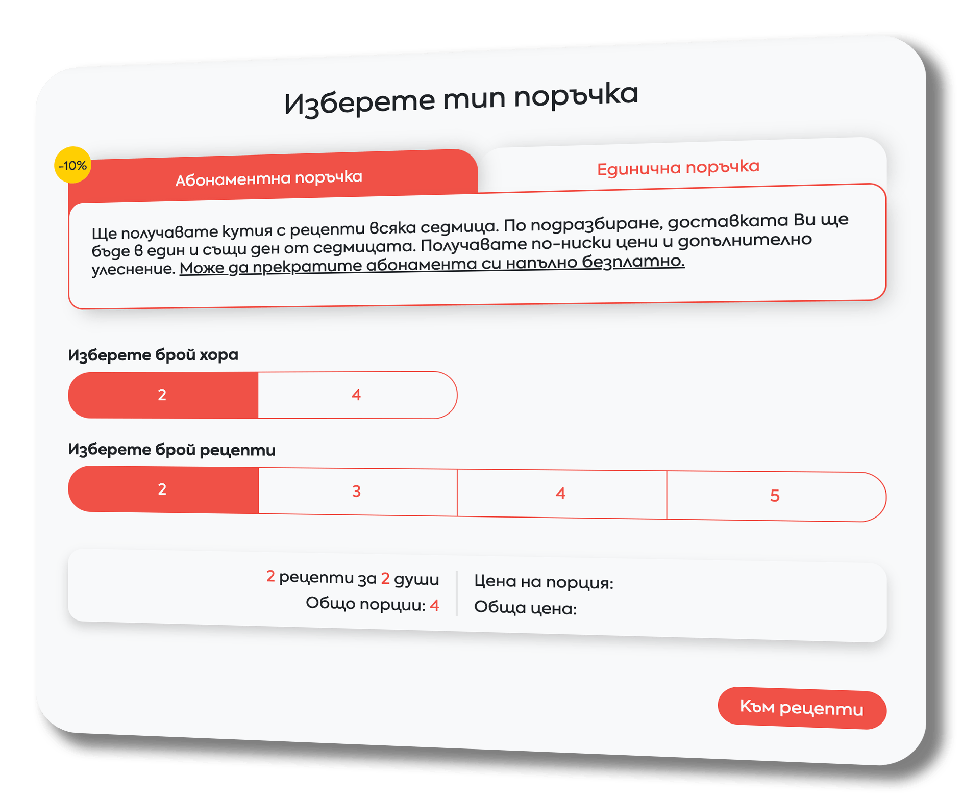 Изберете "Абонаментна" или "Единична" поръчка. При избор на абонаментна поръчка ще получавате кутия с рецепти всяка седмица.